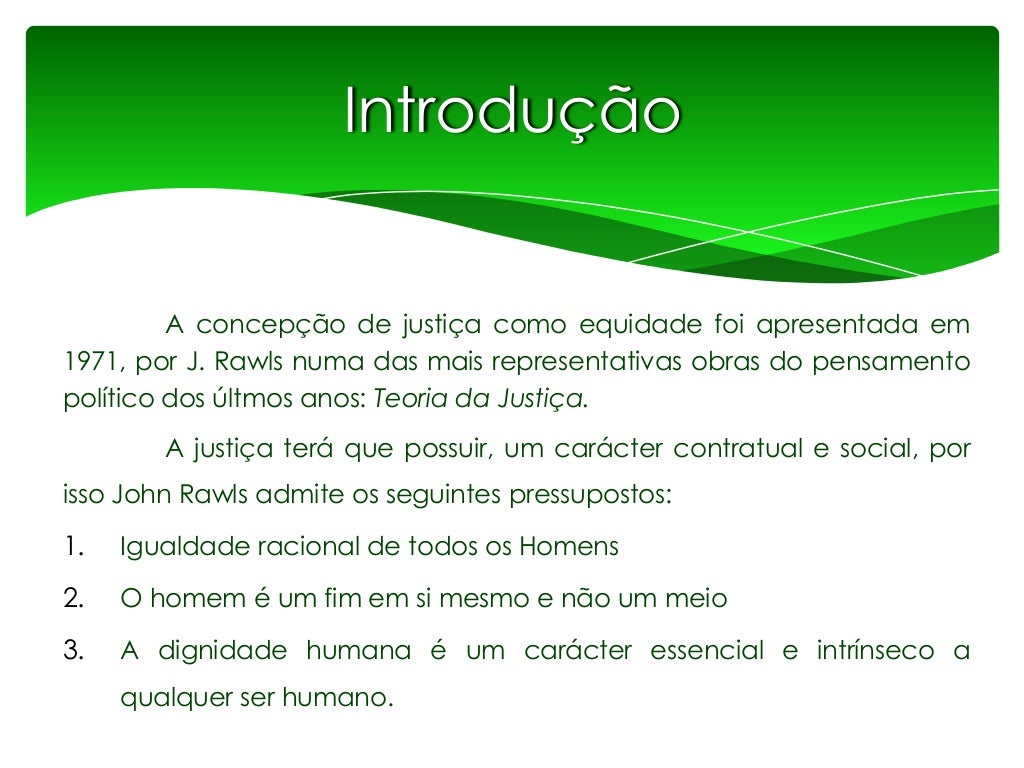 concepção de justiça que denominou de "justiça como eqüi dade"1. De acordo ess com concepçãoa , os princípios de justiça mais razoáveis seria aquelem qus e fossem objeto de acordo mútuo entr pessoae s em condições eqüitativas. A jus tiça como eqüidad portantoe é, um, a teoria da justiça que parte da idéia de um contrato.