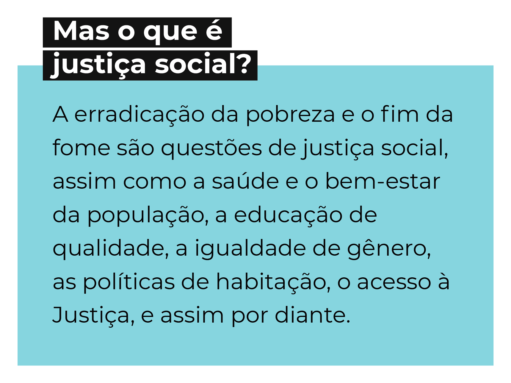 Assim, compreender o que é a justiça social, é, na verdade, compreender sua conexão com os ideais de igualdade e equidade. E são esses valores que balizam políticas e lutas para a construção de uma sociedade melhor. Pois é notável que em diferentes sociedades de diferentes posicionamentos econômicos há, vez ou outra, o risco de.