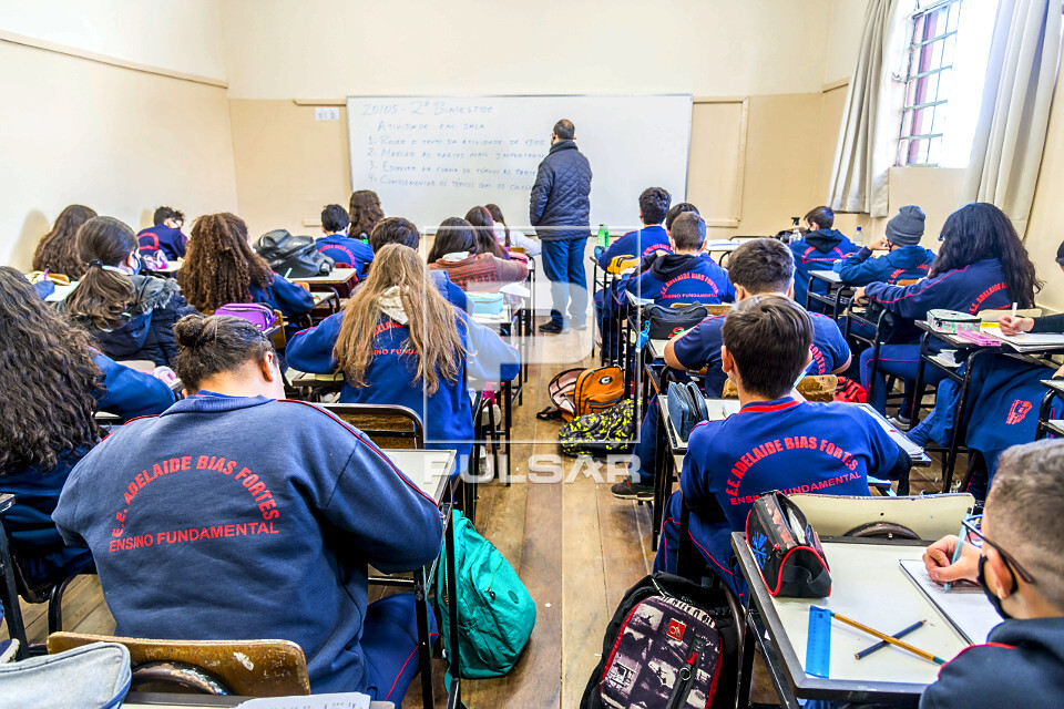 Professor de português e alunos em sala de aula do sétimo ano do ensino fundamental II na Escola