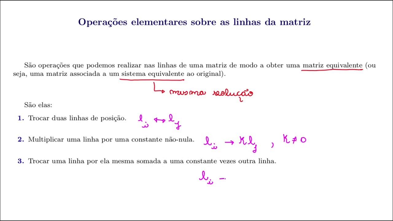 4.1. Eliminação gaussiana. A eliminação gaussiana , também conhecida como escalonamento, é um método para resolver sistemas lineares. Este método consiste em manipular o sistema através de determinadas operações elementares, transformando a matriz estendida do sistema em uma matriz triangular (chamada de matriz escalonada do sistema ).