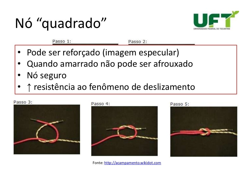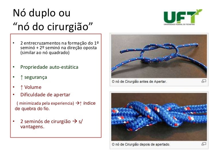Nó de Cirurgião. 5 Comentários. IN : Unir pontas, O Nó de Cirurgião, como o nome sugere, é utilizado em casos de emergência, pois une as pontas de maneira muito estável, sendo extremamente difícil de ceder ou soltar involuntariamente. Passo a passo. 41885 Visualizações. Compartilhe.