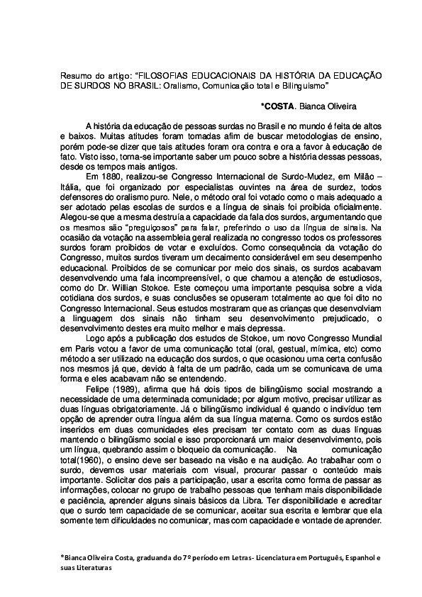 (DOC) Resumo do artigo "FILOSOFIAS EDUCACIONAIS DA HISTÓRIA DA EDUCAÇÃO DE SURDOS NO BRASIL