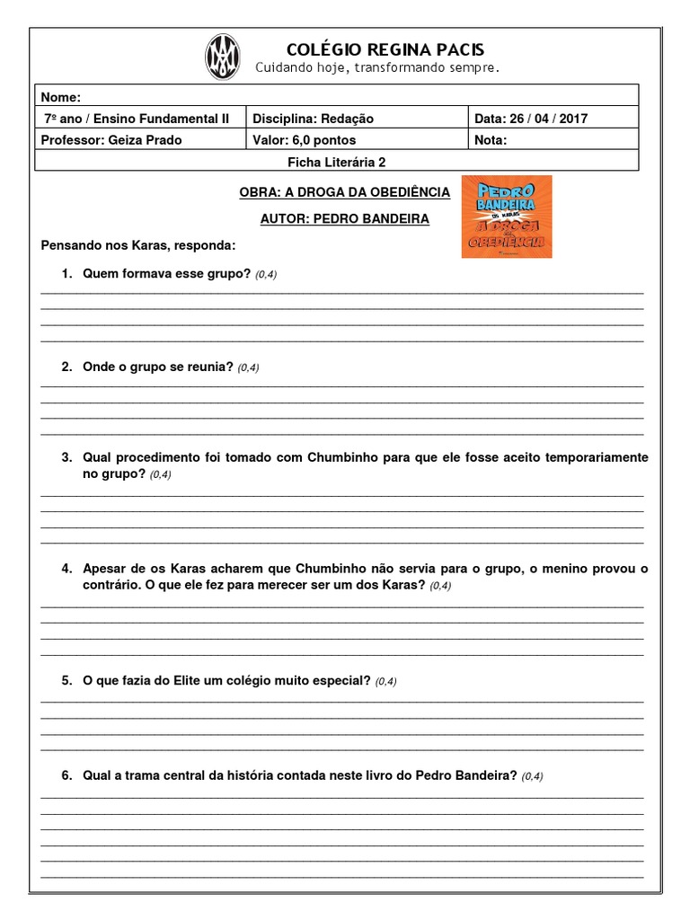 No livro "Droga Da Obediência", os Karas se deparam com uma droga que está sendo distribuída nas escolas, fazendo com que os alunos se tornem obedientes e submissos.. Em resumo, o livro "Droga Da Obediência" de Pedro Bandeira é uma obra que nos faz refletir sobre a importância da liberdade, da amizade e da luta contra a.