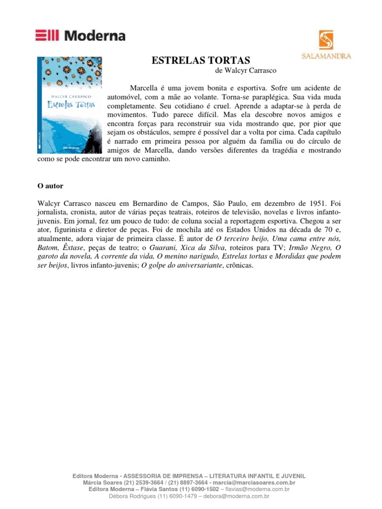 Na correria, postei pouco, mas hoje venho com uma resenha de um livro muito bom - Estrelas Tortas, de Walcyr Carrasco. Livro: Estrelas Tortas. Autor: Walcyr Carrasco. Editora: Moderna. Edição: 2003. Páginas: 104. Sinopse: Marcella é uma jovem bonita e esportiva. Sofre um acidente de automóvel, com a mãe ao volante.