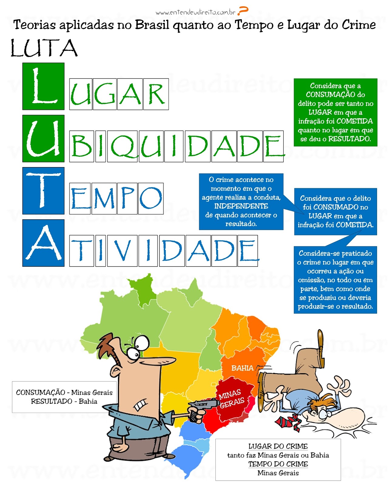 2) Lugar do crime: Assim como o tempo do crime, o lugar do crime possui 3 principais teorias, vejamos: Teoria da Atividade: Para essa teoria, o lugar do crime será aquele onde ocorreu a ação ou omissão. Para exemplificar e tornar mais didático, vamos imaginar que João com a intenção de matar Roberto, dispara sua arma contra ele na.